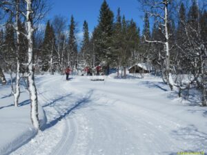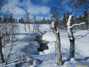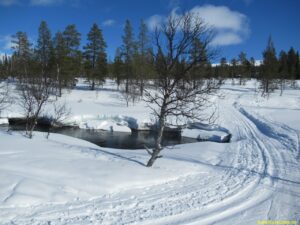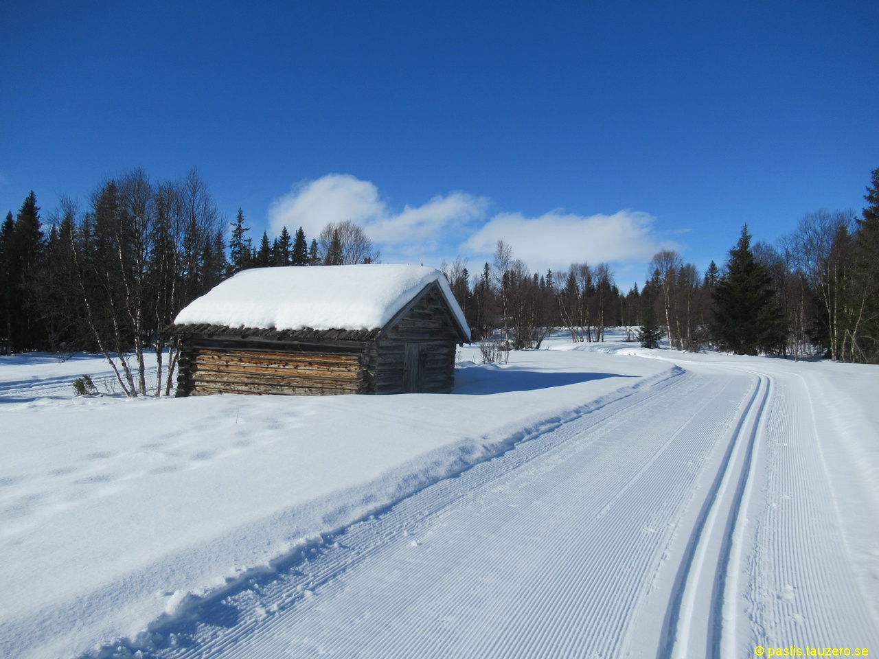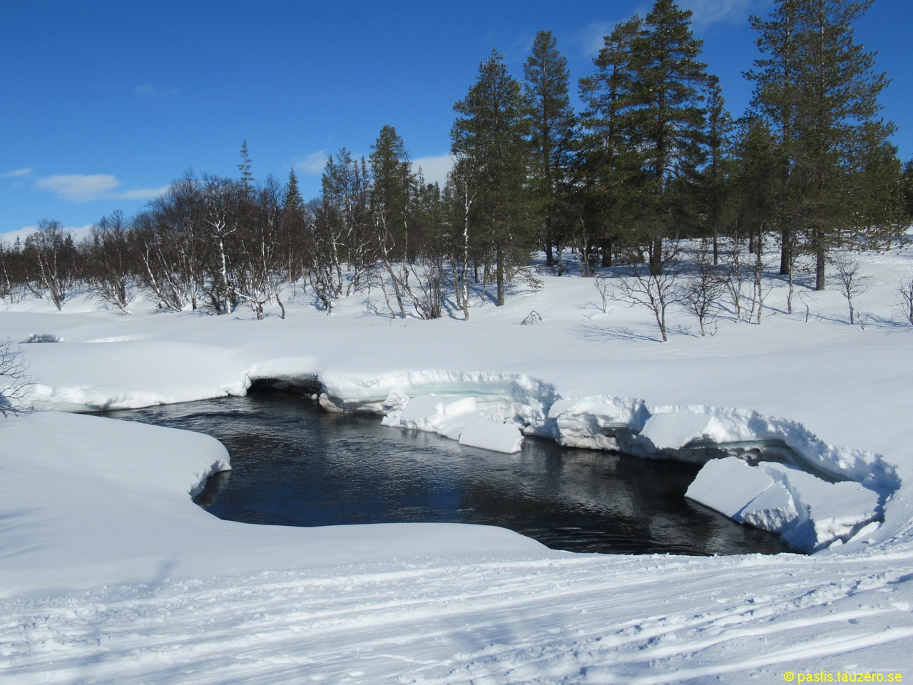 Idag blev det åter en vacker skidtur i strålande väder! Vi åkte ner mot Grövlan från Olåns rastplats och det var sista gången denna säsong. Det spåret är nu avstängt då isbron håller på att rasa ihop över Grövlan. Lite synd, en fin sträcka och man önskar sig en riktig bro där. Vore bra även på sommar/höst-vandringarna!