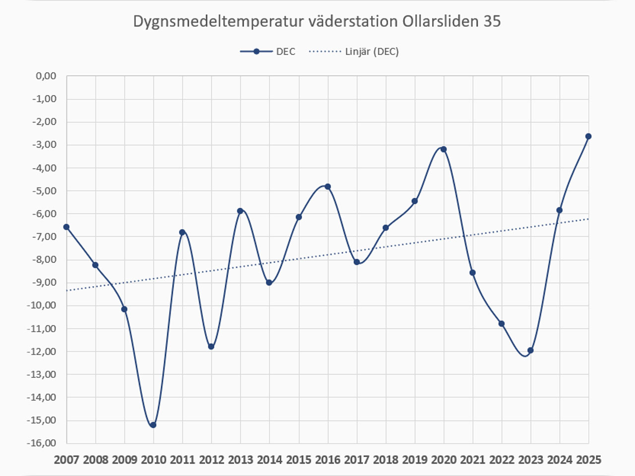 Ni kan se den prickiga trendlinjen här nedan för dygnsmedeltemperaturen i december.